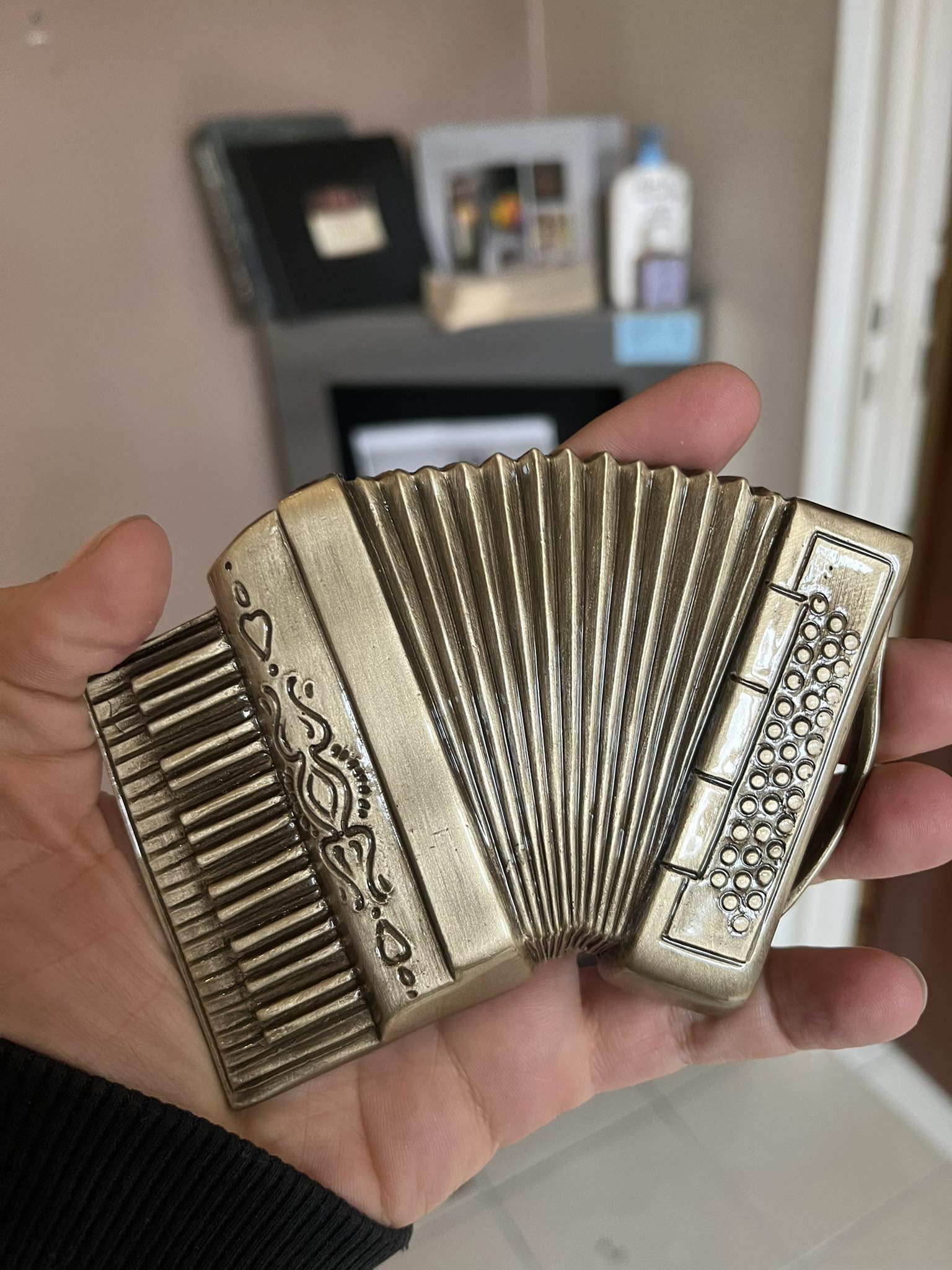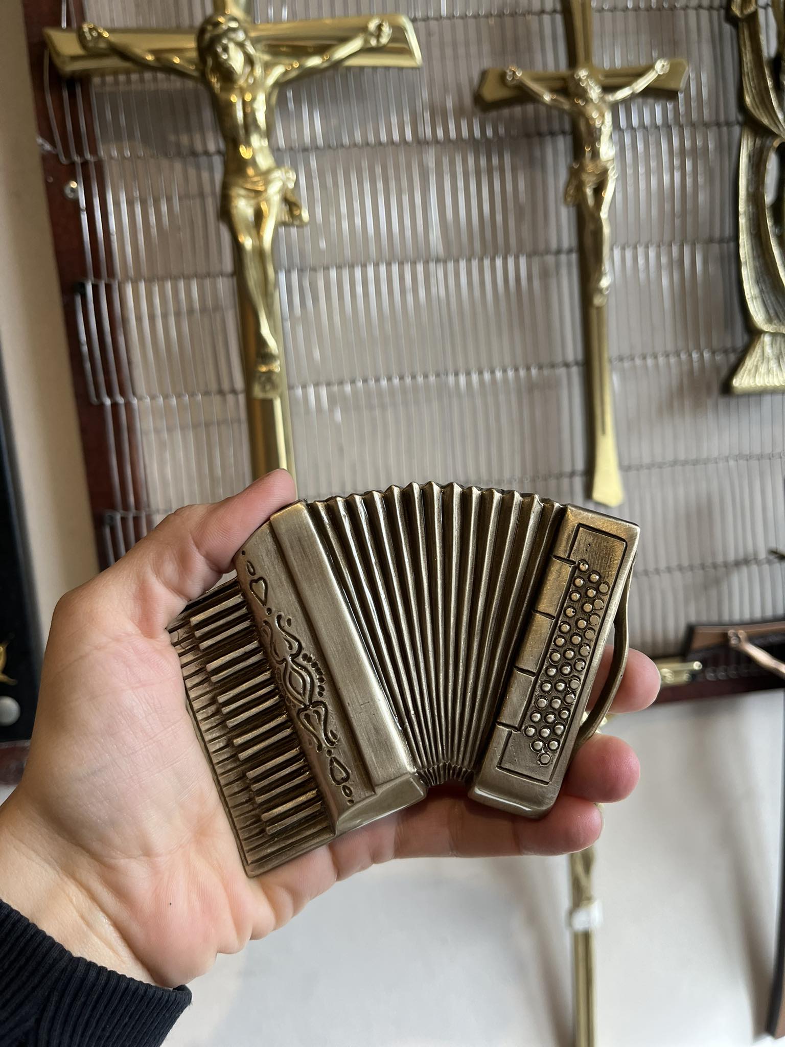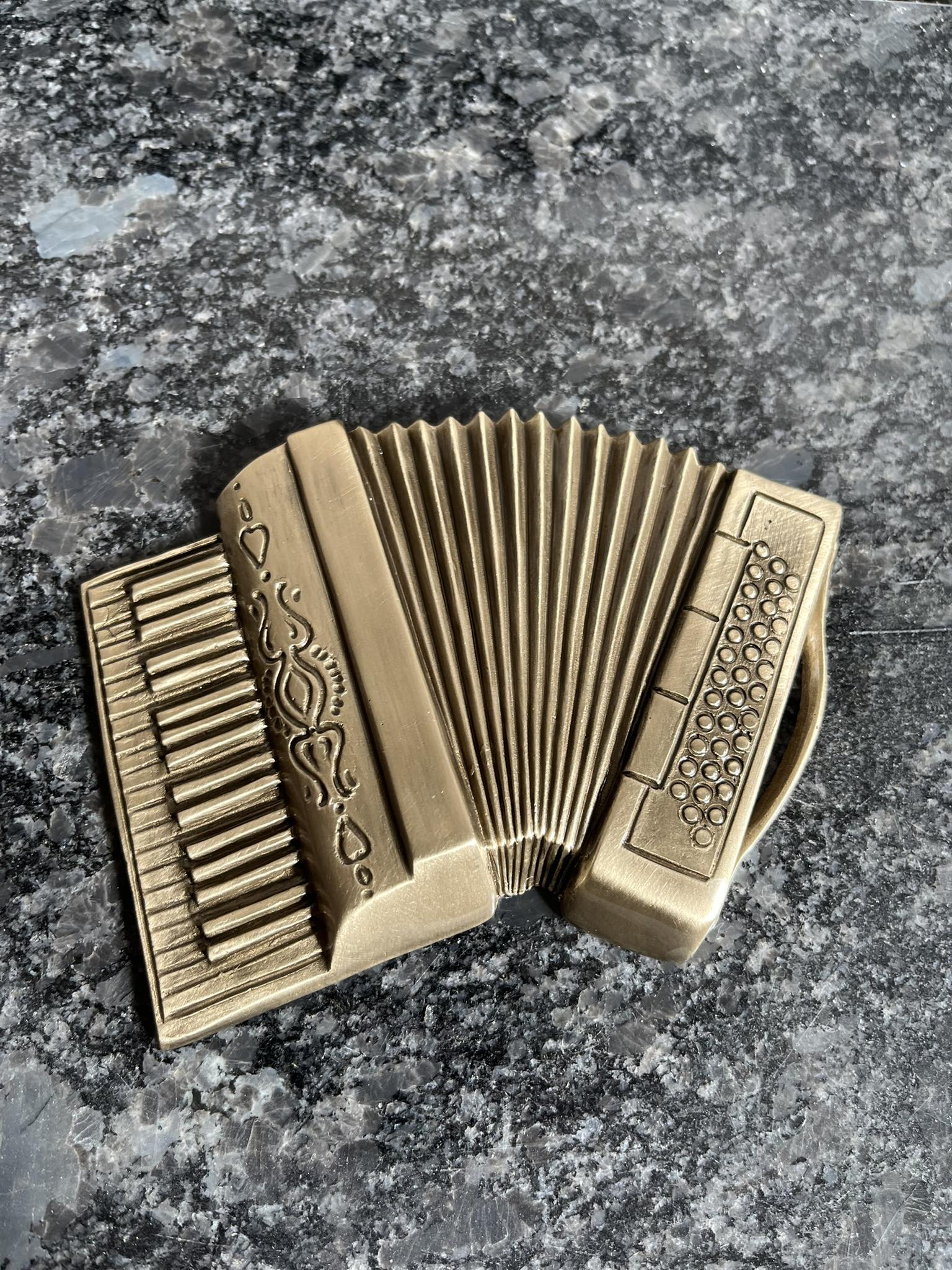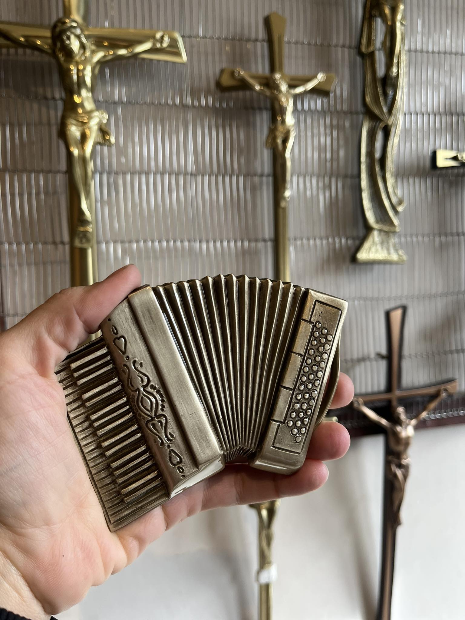 Spersonalizowana ozdoba nagrobna. Piękny akordeon z brązu dla zmarłych, którzy kochali ten instrument. Wykonany z brązu, odporna na działanie warunków atmosferycznych. Wysokość 9 cm, szerokość 12,2 cm, głębokość/grubość 1,3 cm.
