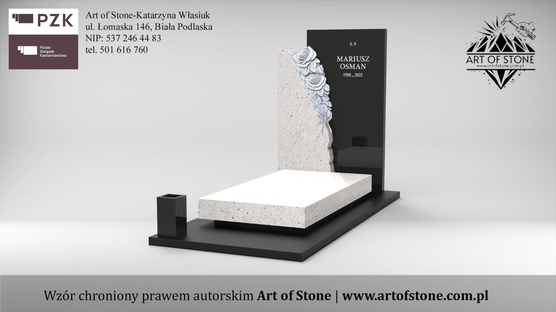 *Wzór chroniony prawem autorskim. Wykorzystanie grozi konsekwencjami prawnymi zarówno dla Zleceniodawcy, jak i Wykonawcy. Jeżeli chcesz zamówić taki nagrobek u lokalnego kamieniarza kup projekt z licencją na jednorazowe wykorzystanie.