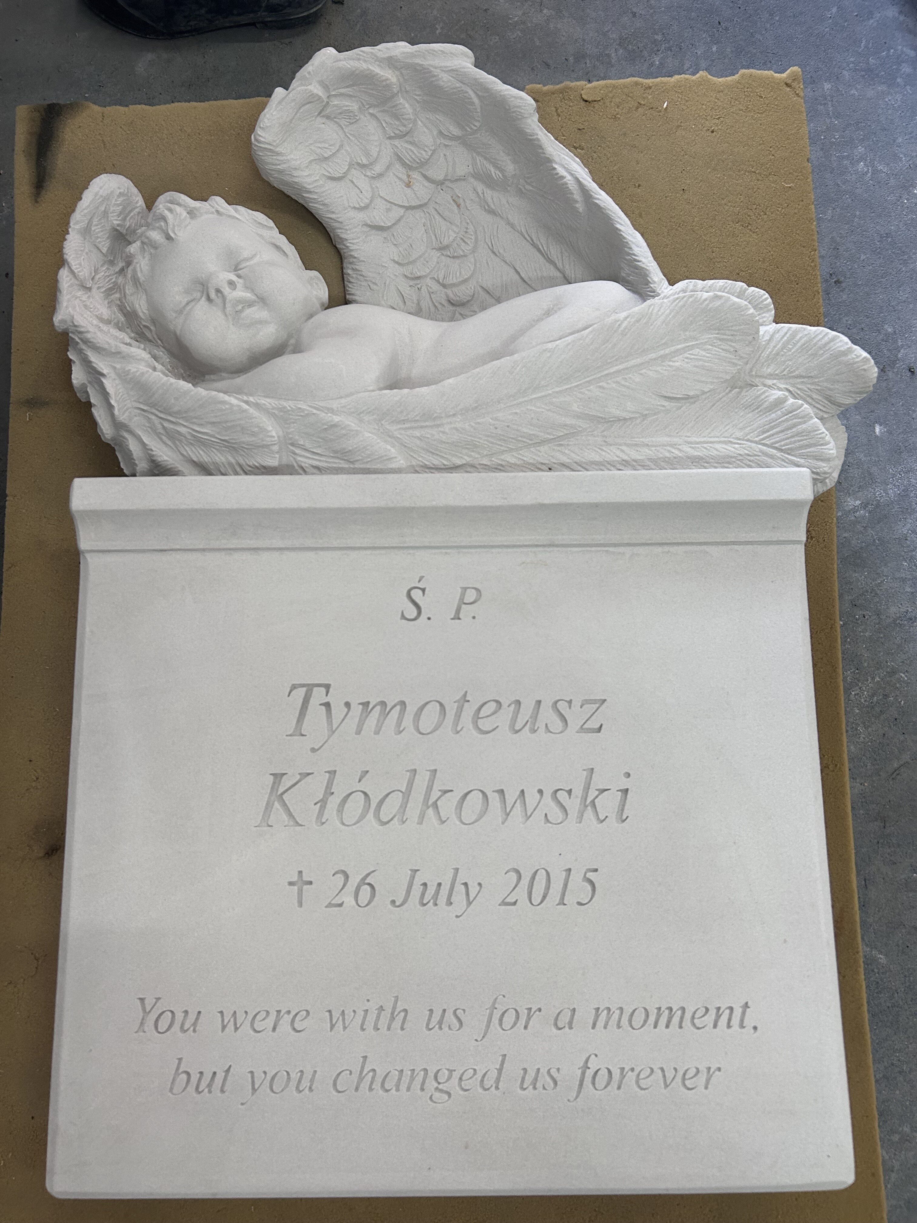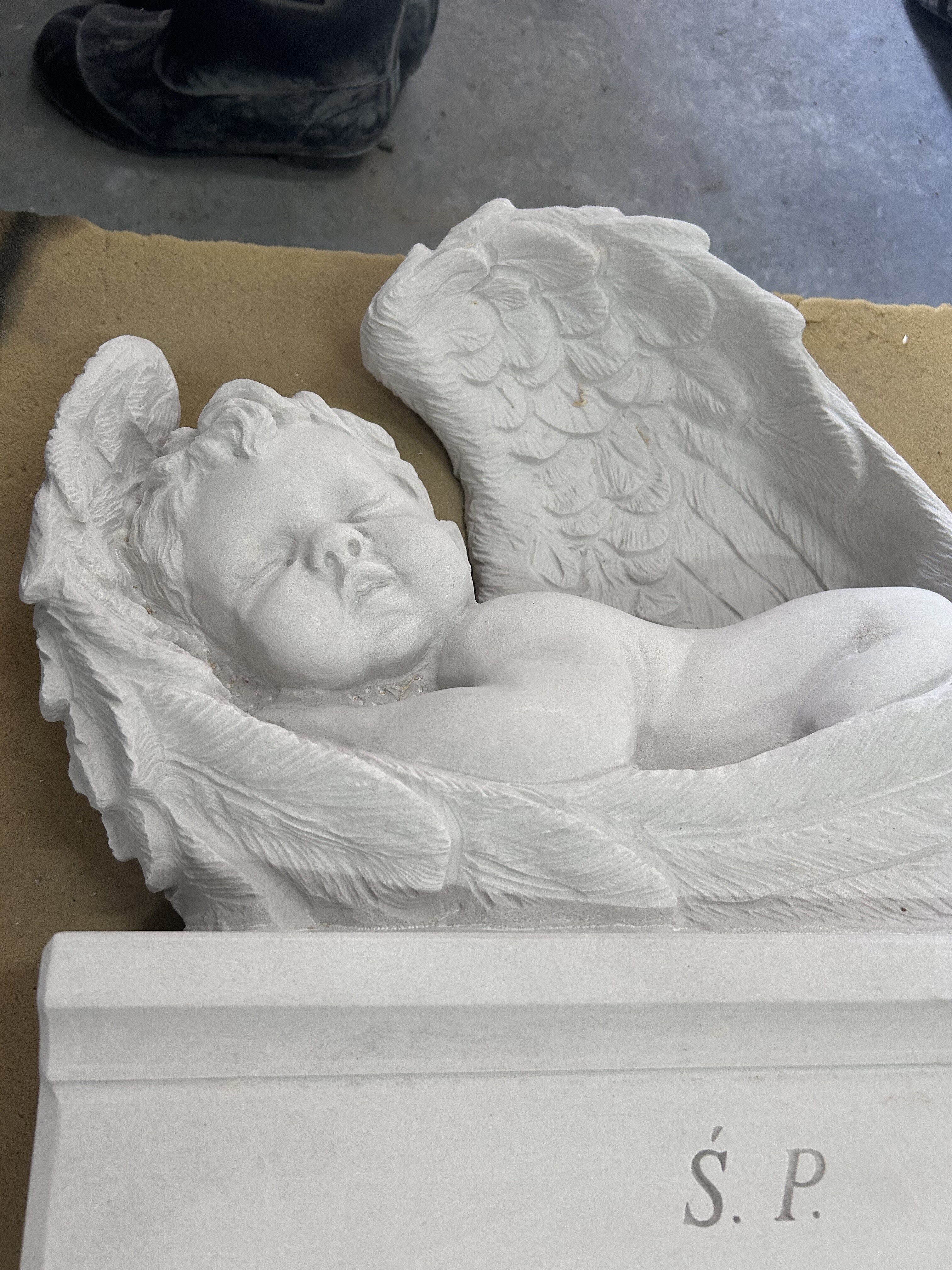 - rzeźba anioła (tablica i rzeźba z jenego elementu-materiał marmur Bianco Carrara lub piaskowiec Szydłowiecki)
