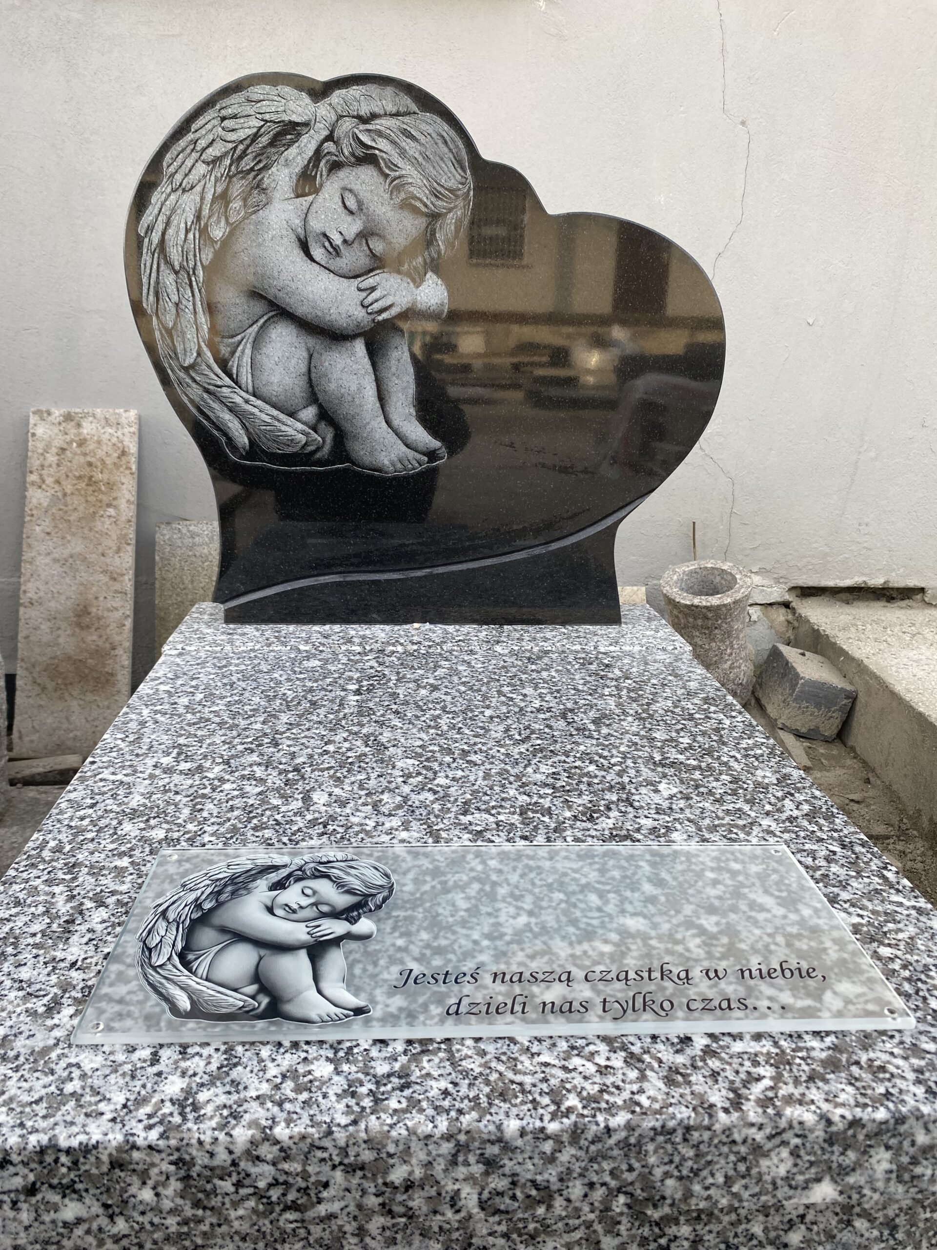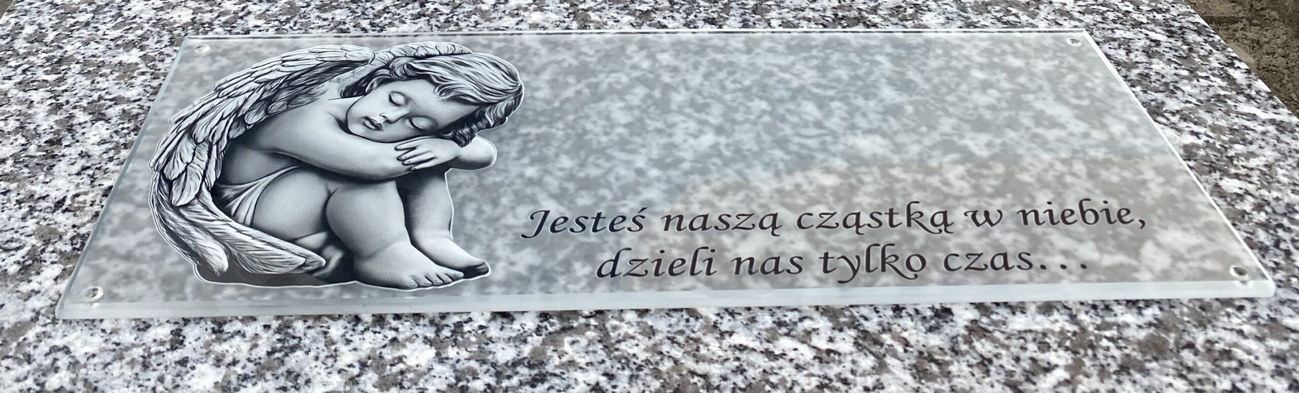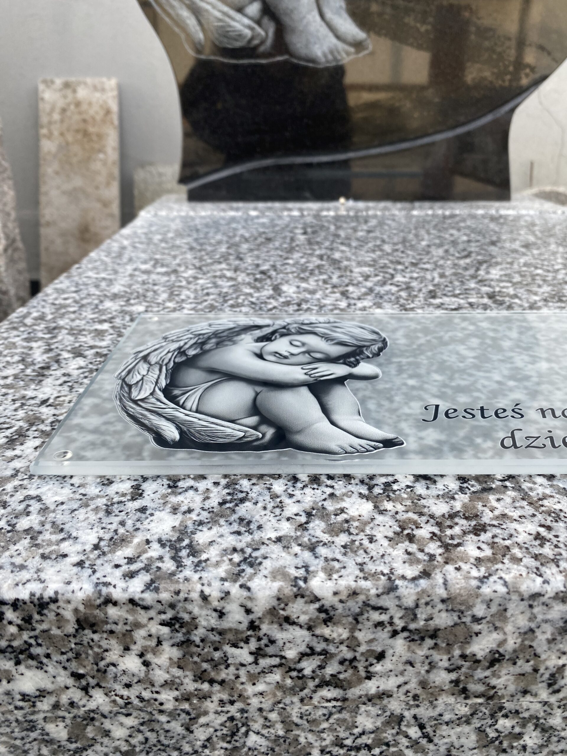 Wyjątkowa, zaprojektowana przez nas podstawka pod znicze ze szkła, z pięknym aniołkiem. Wzór chroniony prawem autorskim. 40x17 cm
