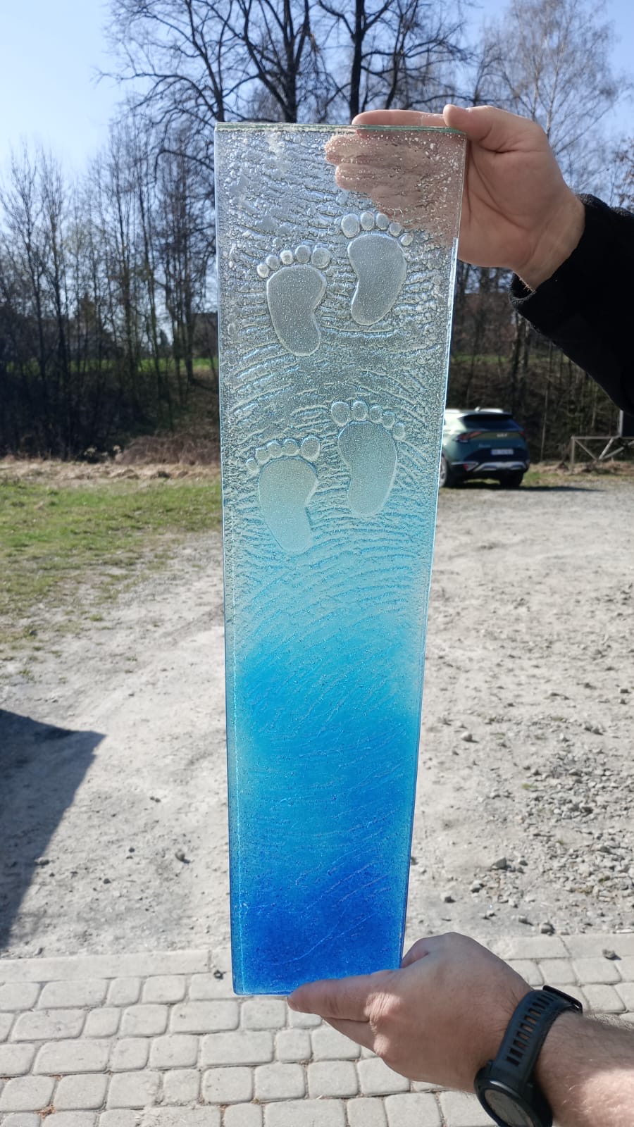 Piękne szkło do nagrobka dziecięcego. Wyjątkowa realizacja szkła artystycznego, odpornego na warunki atmosferyczne.