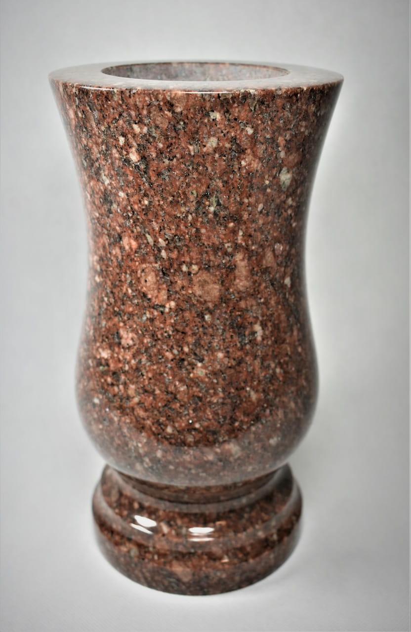 Wazon z granitu jest bardzo wytrzymały i ciężki. Jest odporny na zarysowania i plamy. Gładka powierzchnia jest odporna na działanie warunków atmosferycznych i łatwa do czyszczenia. Dodatkowo można go przykleić silikonem do płyty nagrobnej. W każdym wazonie bezpłatnie wiercimy drobny otwór u dołu, dzięki czemu nie pęknie zimą. Waga ok. 6 kg. Bezpłatnie otrzymasz plastikowy wkład do wazonu.
